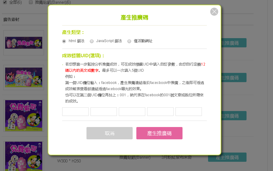 選擇第一個「html語法」後,點擊底下「產生推廣碼」,畫面如下: